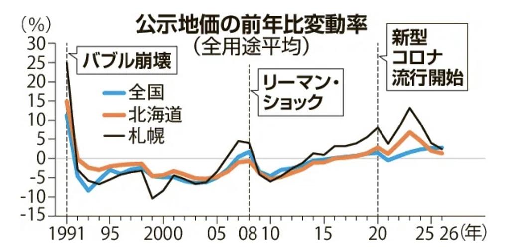 北海道の公示地価は前年比1.3%上昇し10年連続プラス。ただし前年(2%)より鈍化し、全国平均も下回った。 - ・千歳は好調、札幌は減速